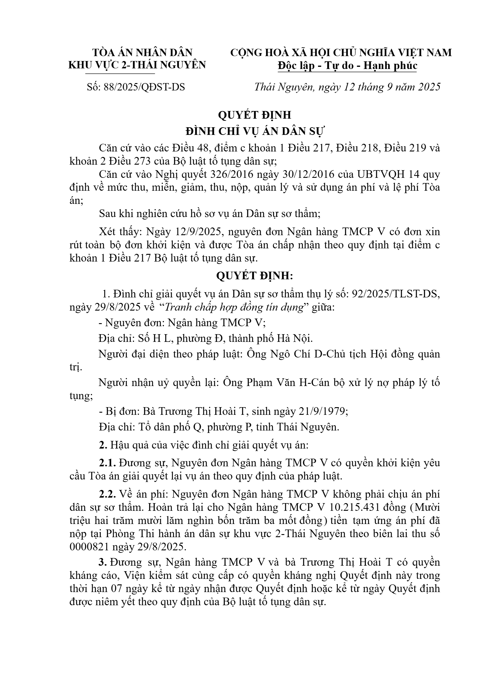 Quyết định số 88/2025/QĐST-DS ngày 12/09/2025 của Tòa án nhân dân khu vực 2 - Thái Nguyên, tỉnh Thái Nguyên về tranh chấp hợp đồng vay tài sản