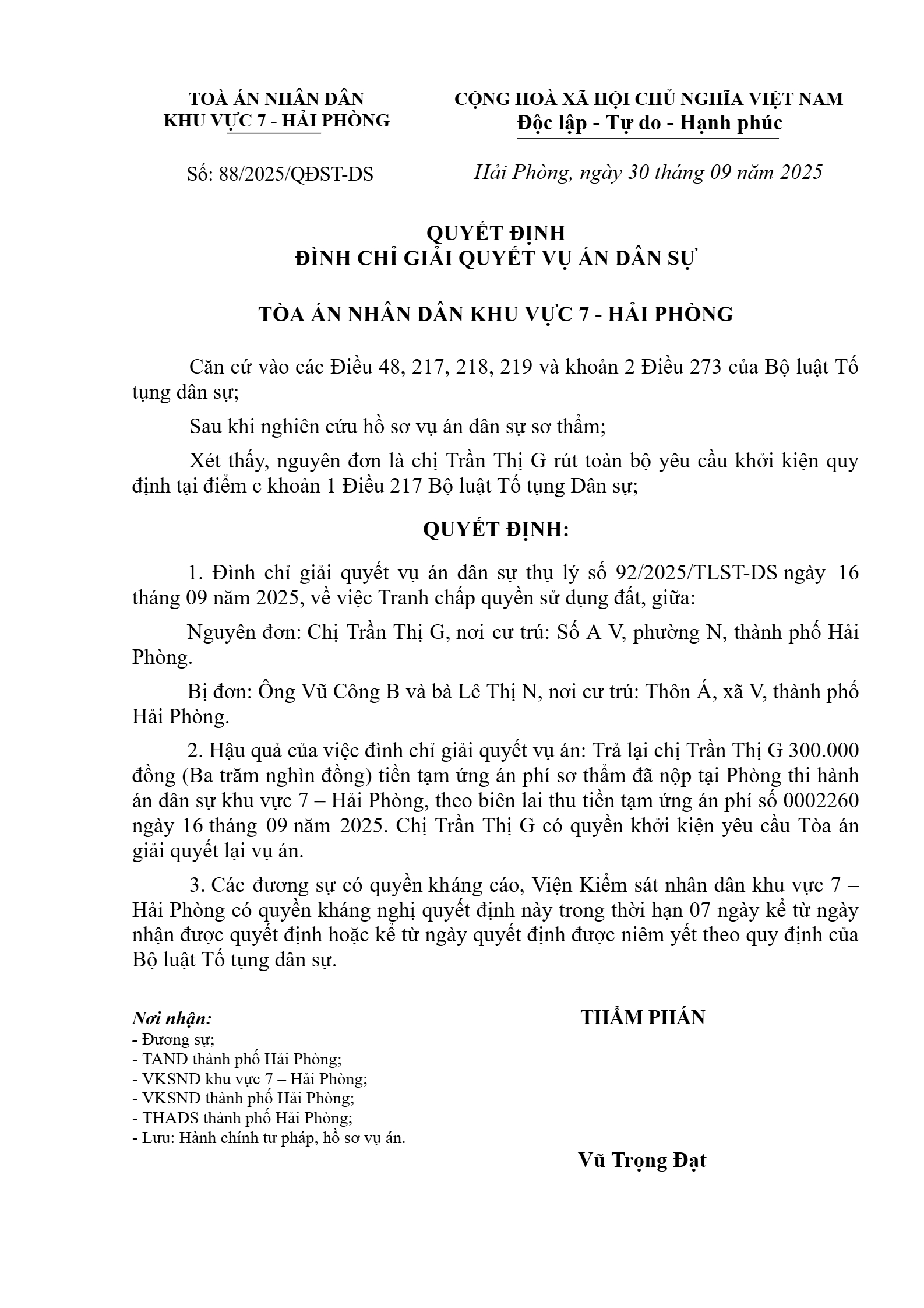 Quyết định số 88/2025/QĐST-DS ngày 30/09/2025 của Tòa án nhân dân khu vực 7 - Hải Phòng, TP. Hải Phòng về tranh chấp quyền sử dụng đất