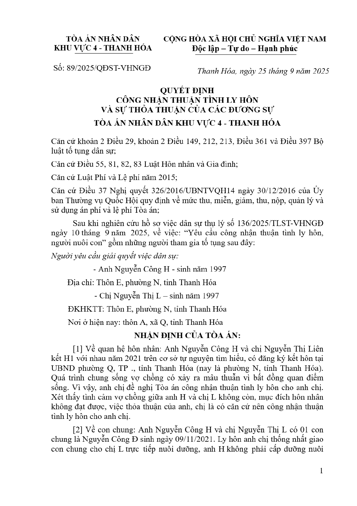 Quyết định số 89/2025/QĐST-HNGĐ ngày 25/09/2025 của Tòa án nhân dân khu vực 4 - Thanh Hóa, tỉnh Thanh Hóa về yêu cầu công nhận thuận tình ly hôn