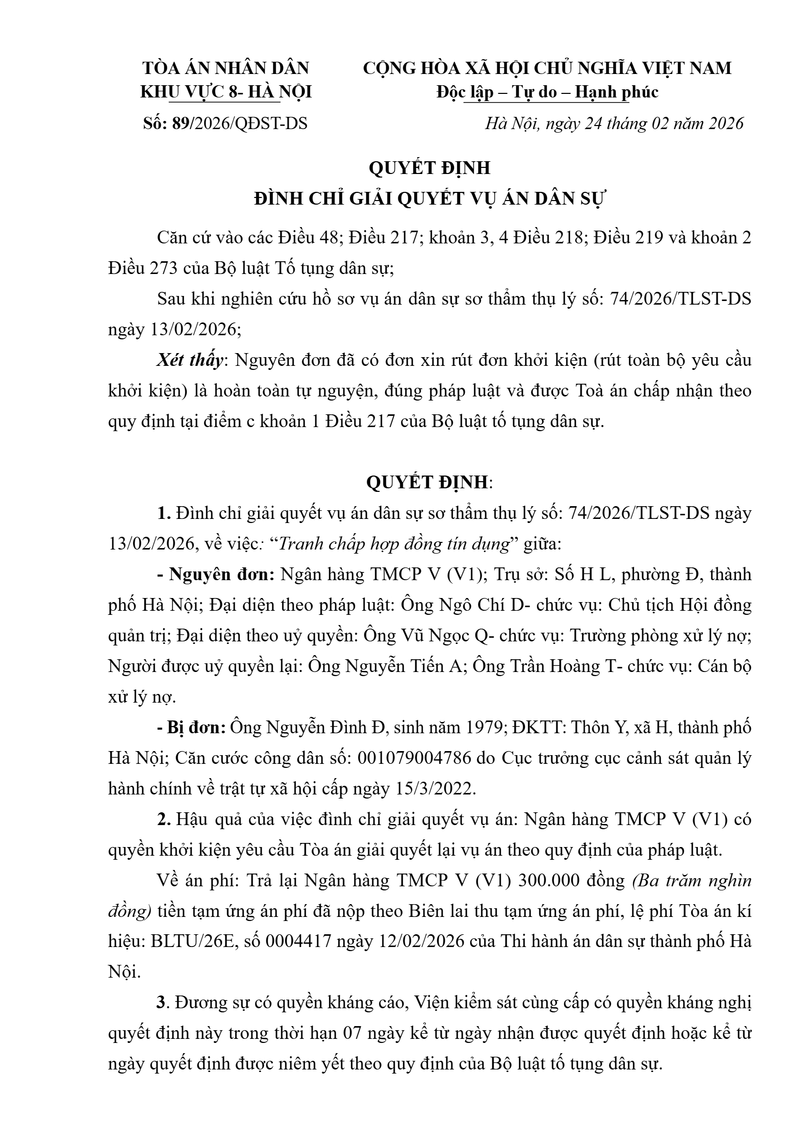 Quyết định số 89/2026/QĐST-DS ngày 24/02/2026 của Tòa án nhân dân khu vực 8 - Hà Nội, TP. Hà Nội về tranh chấp hợp đồng tín dụng