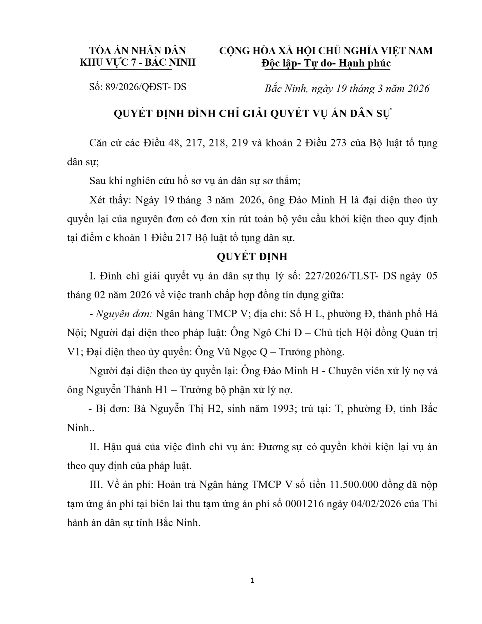 Quyết định số 89/2026/QĐST-DS ngày 19/03/2026 của Tòa án nhân dân khu vực 7 - Bắc Ninh, tỉnh Bắc Ninh về tranh chấp hợp đồng tín dụng