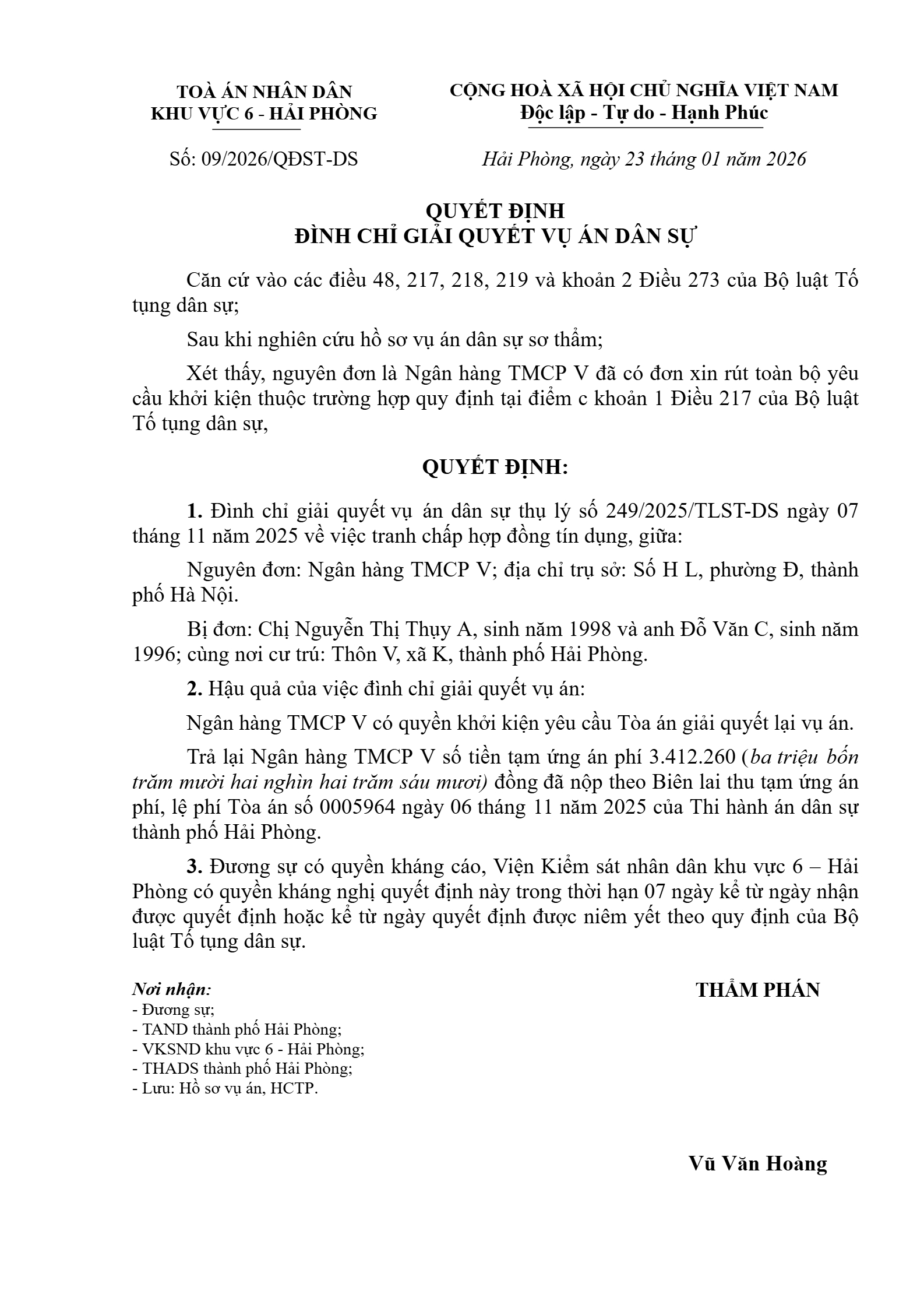 Quyết định số 9/2026/QĐST-DS ngày 23/01/2026 của Tòa án nhân dân khu vực 6 - Hải Phòng, TP. Hải Phòng về tranh chấp hợp đồng tín dụng