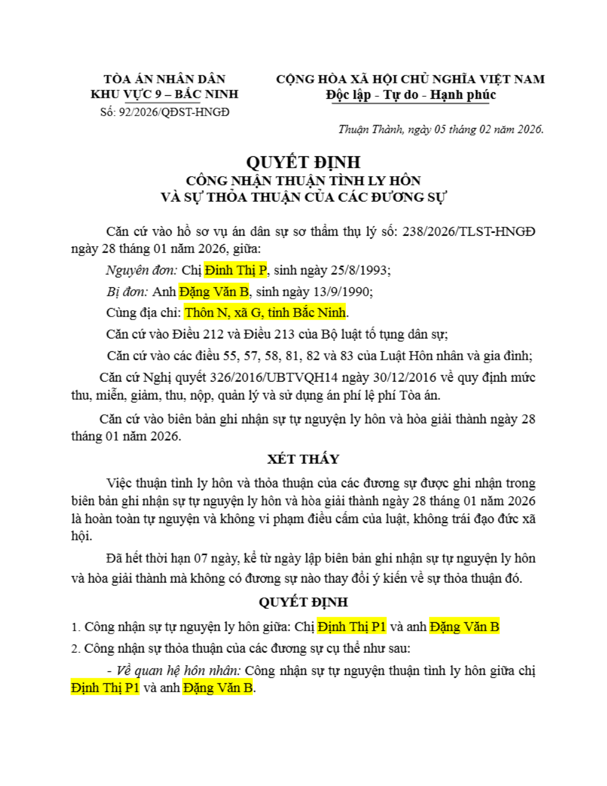 Quyết định số 92/2026/QĐST-HNGĐ ngày 05/02/2026 của Tòa án nhân dân khu vực 9 - Bắc Ninh, tỉnh Bắc Ninh về vụ án ly hôn về mâu thuẫn gia đình