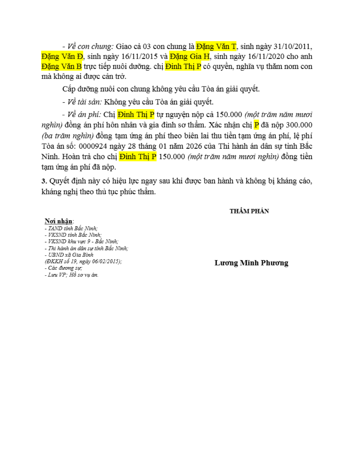 | Thông tin về vụ/việc: | Định thị Phương và Đặng Văn Biên thuận tình ly hôn |