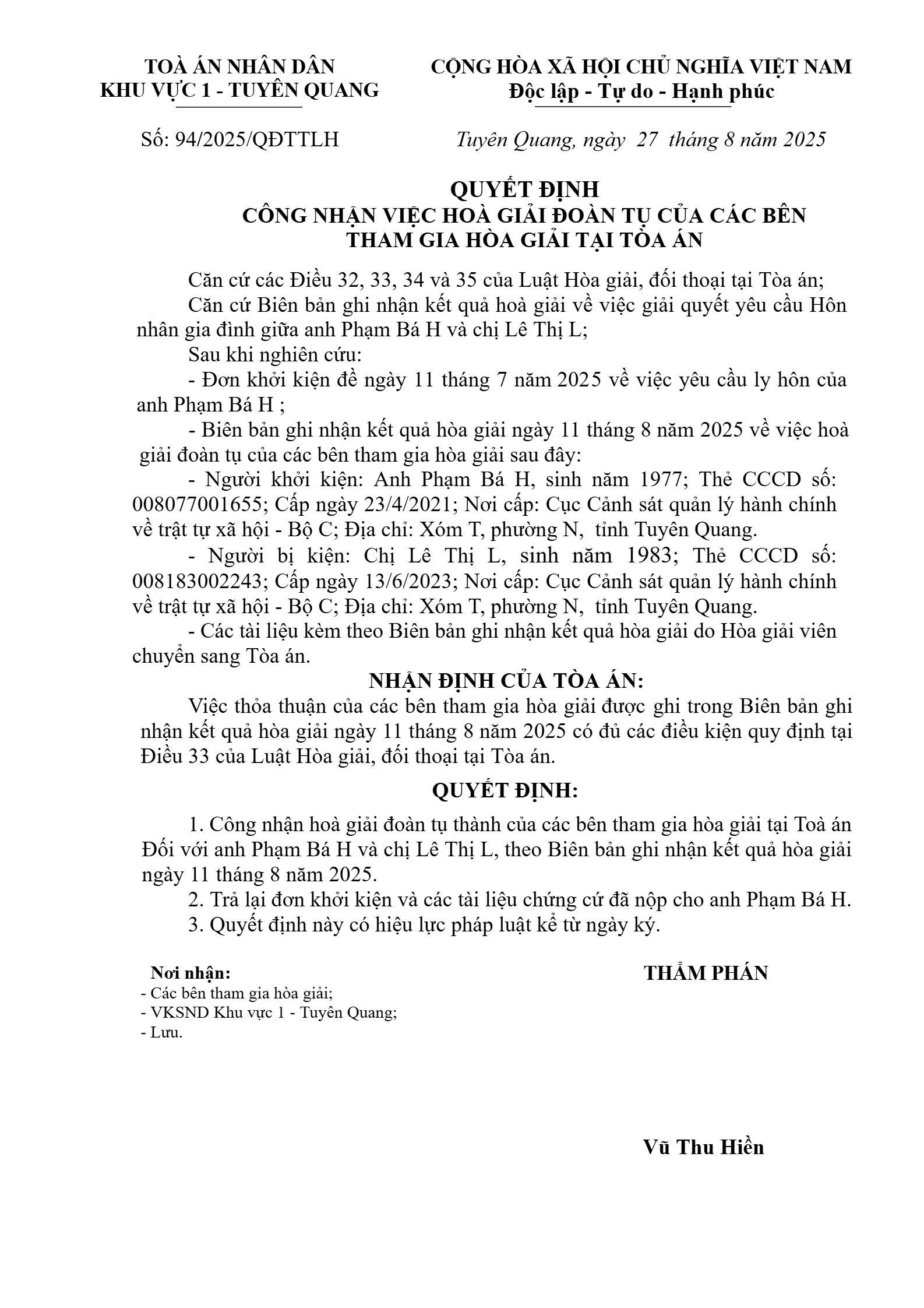 Quyết định số 94/2025/QĐST-HNGĐ ngày 27/08/2025 của Tòa án nhân dân khu vực 1 - Tuyên Quang, tỉnh Tuyên Quang về vụ án ly hôn về mâu thuẫn gia đình