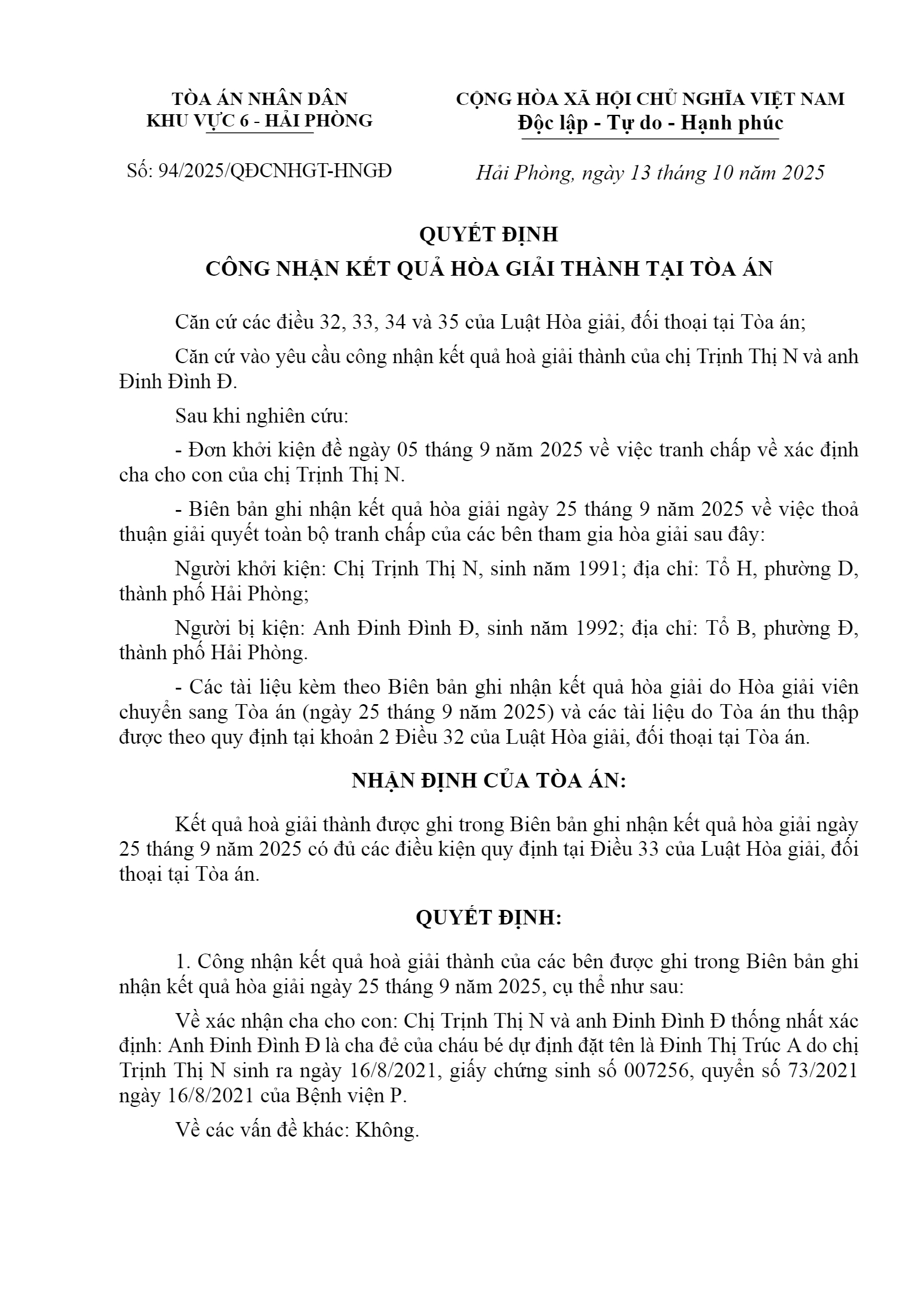 Quyết định số 94/2025/QĐST-HNGĐ ngày 13/10/2025 của Tòa án nhân dân khu vực 6 - Hải Phòng, TP. Hải Phòng về tranh chấp về xác định cha, mẹ cho con hoặc con cho cha mẹ