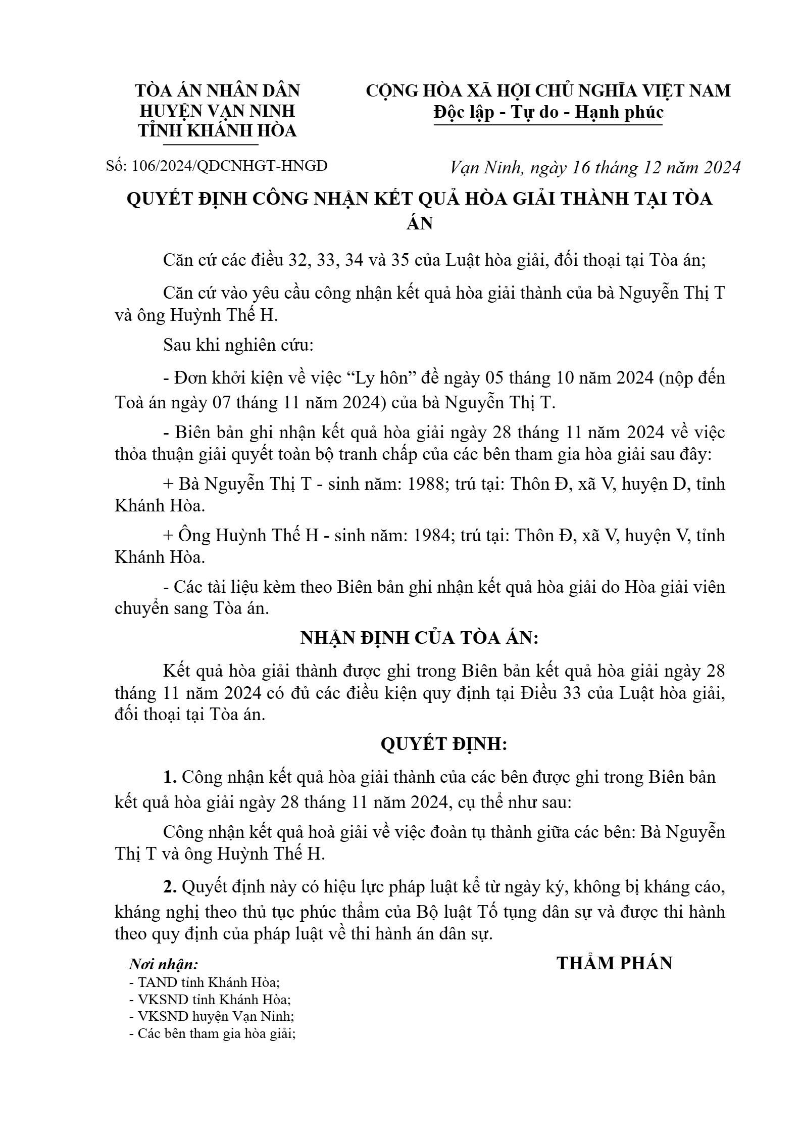 Quyết định số 96/2024/QĐCNHGT-HNGĐ ngày 26/11/2024 của TAND huyện Vạn Ninh, tỉnh Khánh Hòa về vụ án ly hôn về mâu thuẫn gia đình