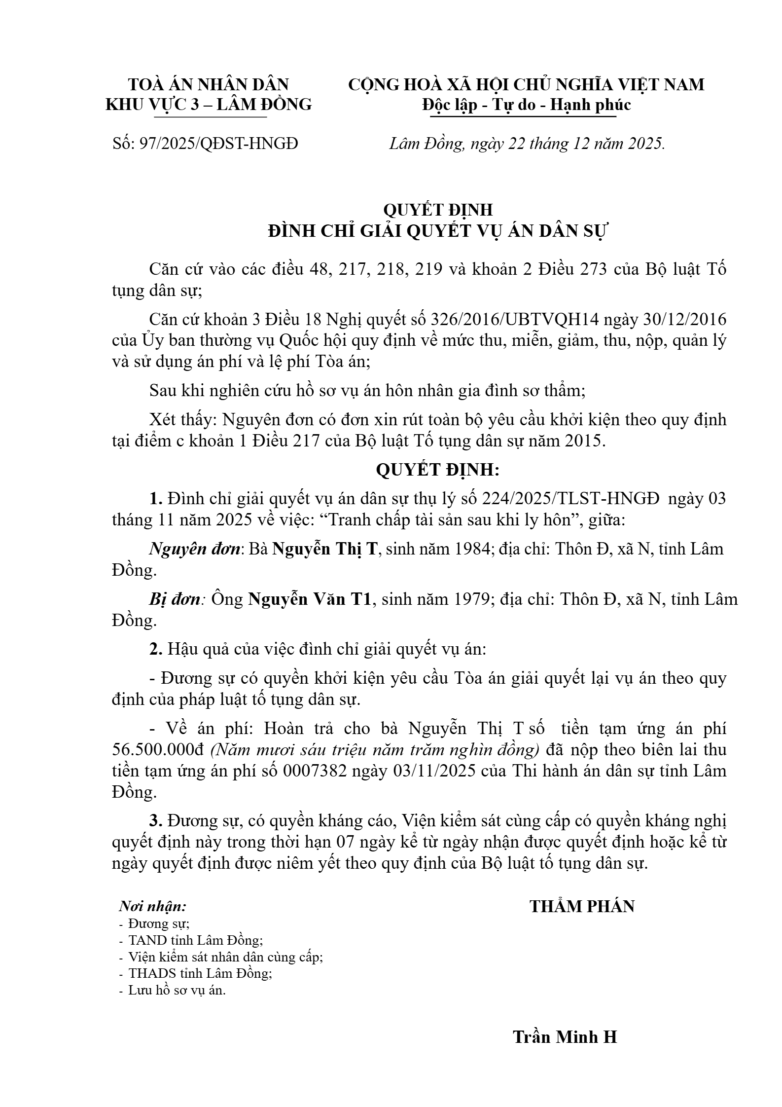 Quyết định số 97/2025/QĐST-HNGĐ ngày 22/12/2025 của Tòa án nhân dân khu vực 3 - Lâm Đồng, tỉnh Lâm Đồng về tranh chấp về chia tài sản khi ly hôn