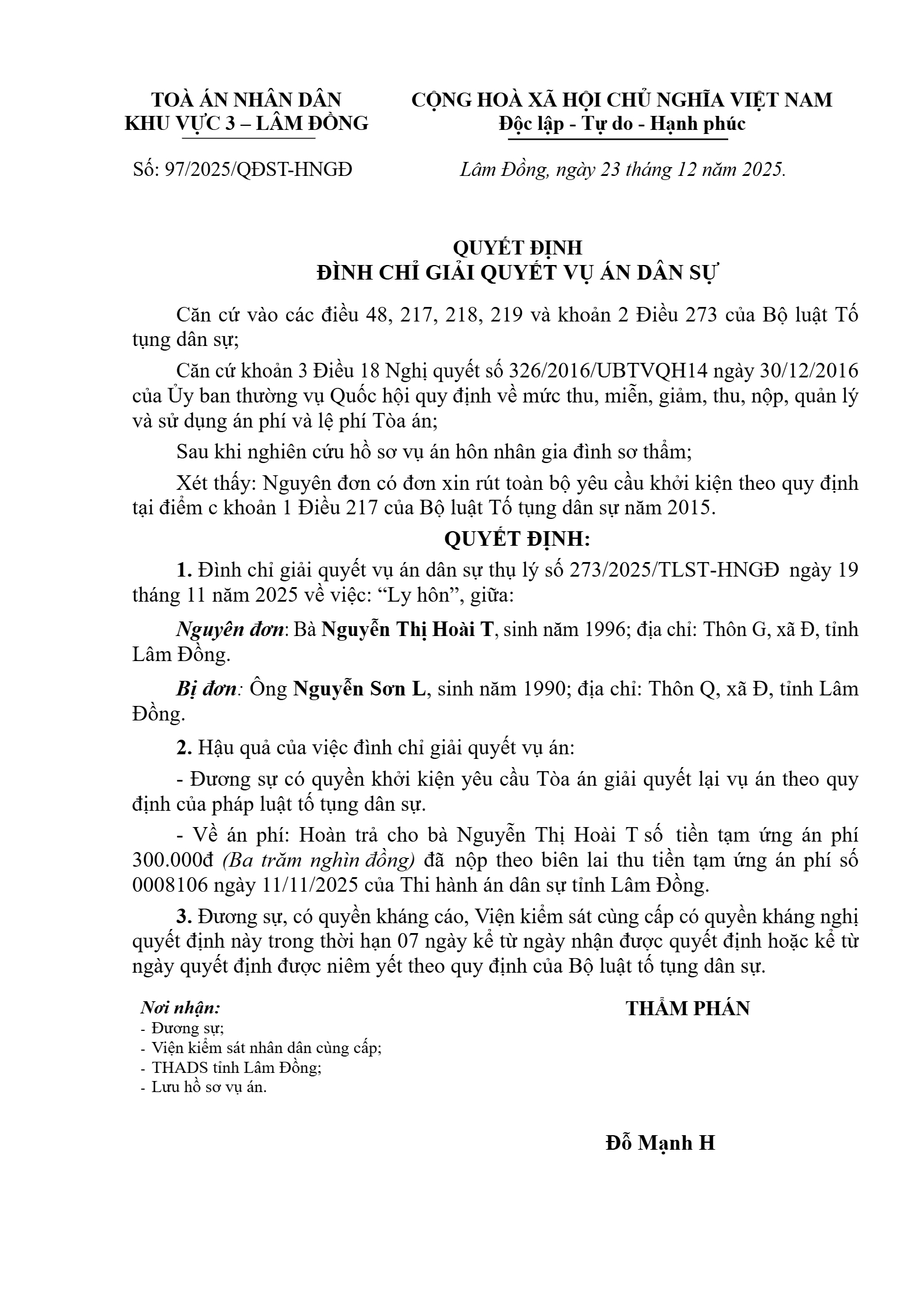 Quyết định số 97/2025/QĐST-HNGĐ ngày 23/12/2025 của Tòa án nhân dân khu vực 3 - Lâm Đồng, tỉnh Lâm Đồng về vụ án ly hôn về mâu thuẫn gia đình