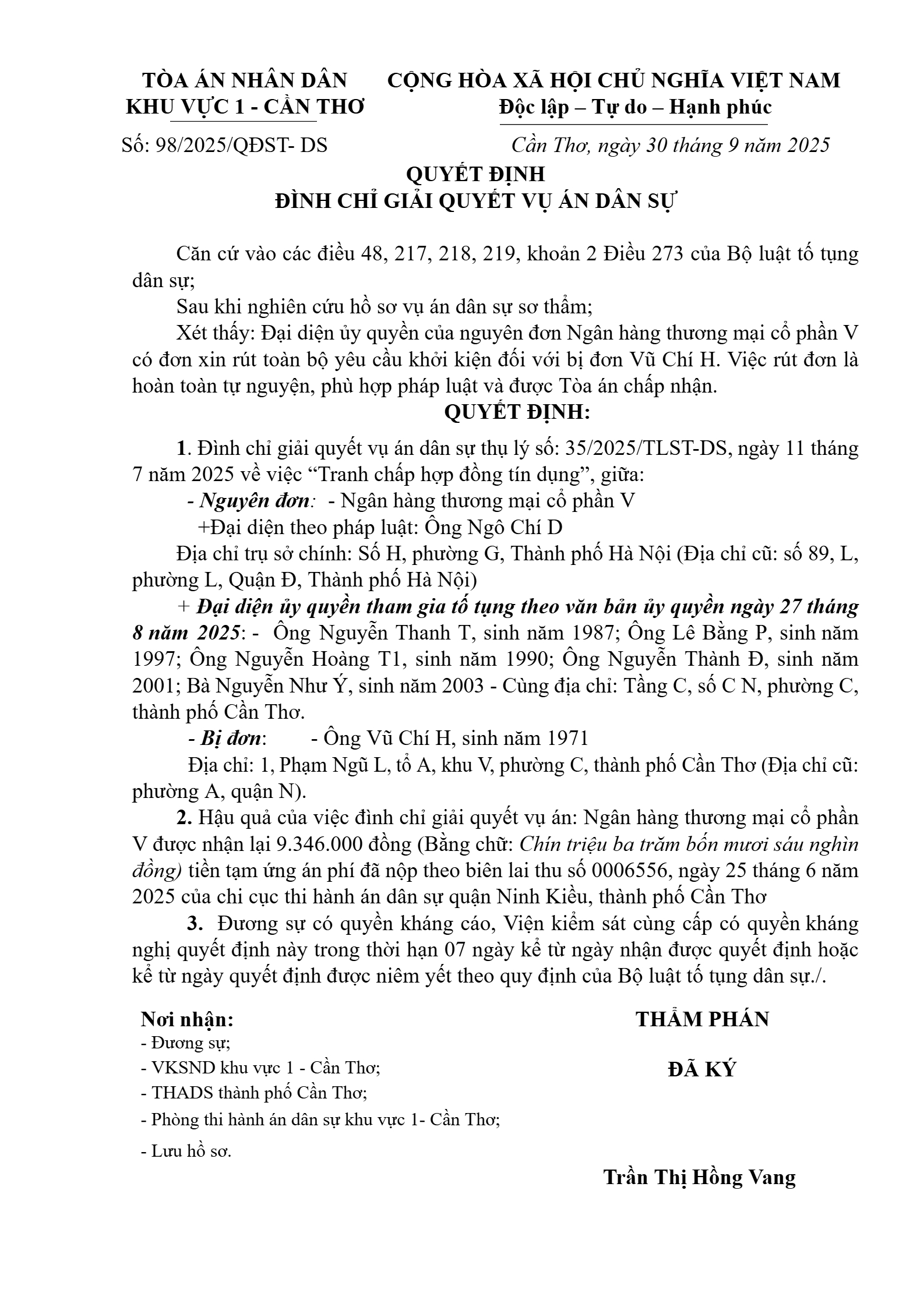 Quyết định số 98/2025/QĐST-DS ngày 30/09/2025 của Tòa án nhân dân khu vực 1 - Cần Thơ, TP. Cần Thơ về tranh chấp hợp đồng tín dụng