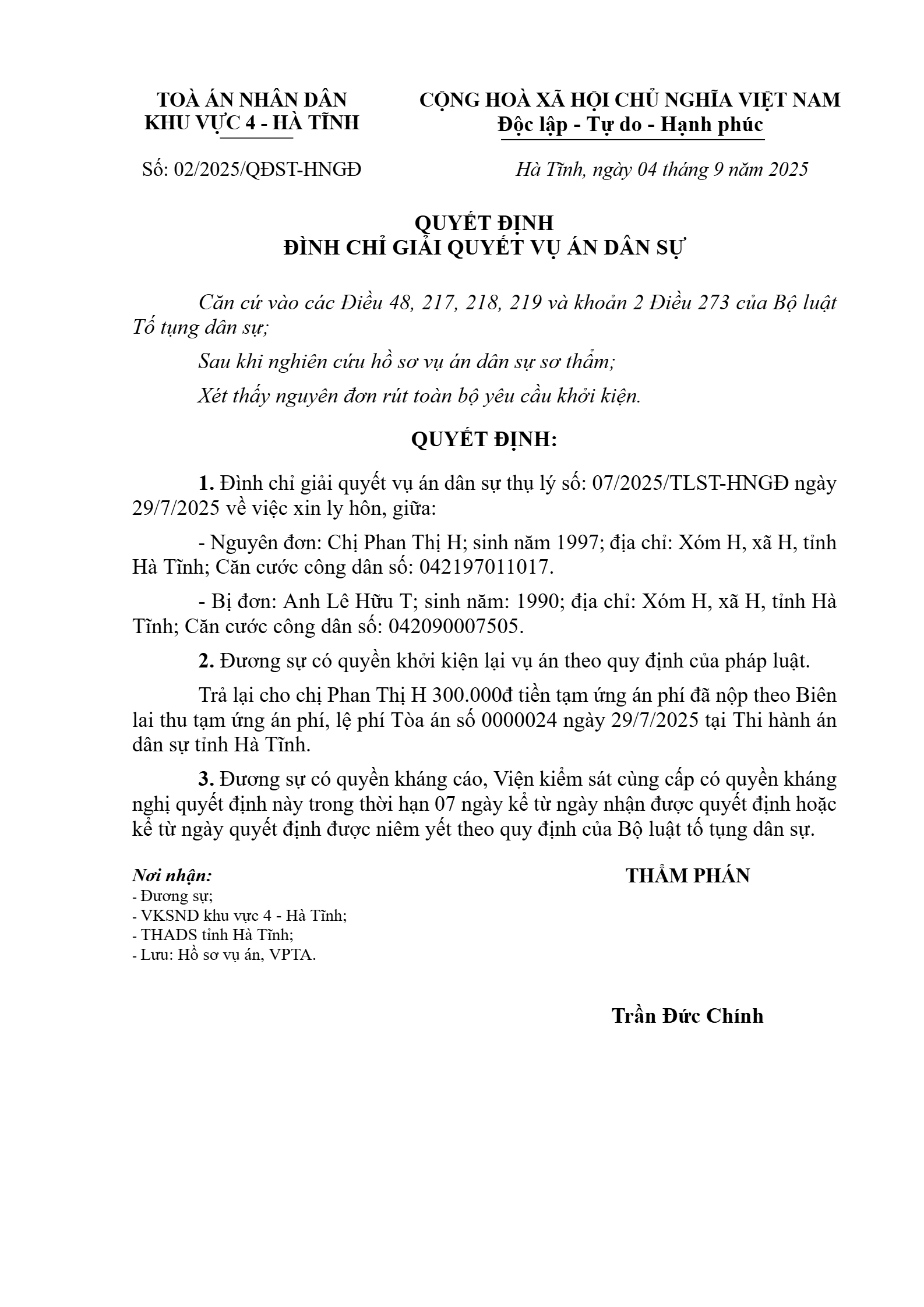 Quyết định số Đình/2025/QĐST-HNGĐ ngày 04/09/2025 của Tòa án nhân dân khu vực 4 - Hà Tĩnh, tỉnh Hà Tĩnh về vụ án ly hôn về mâu thuẫn gia đình