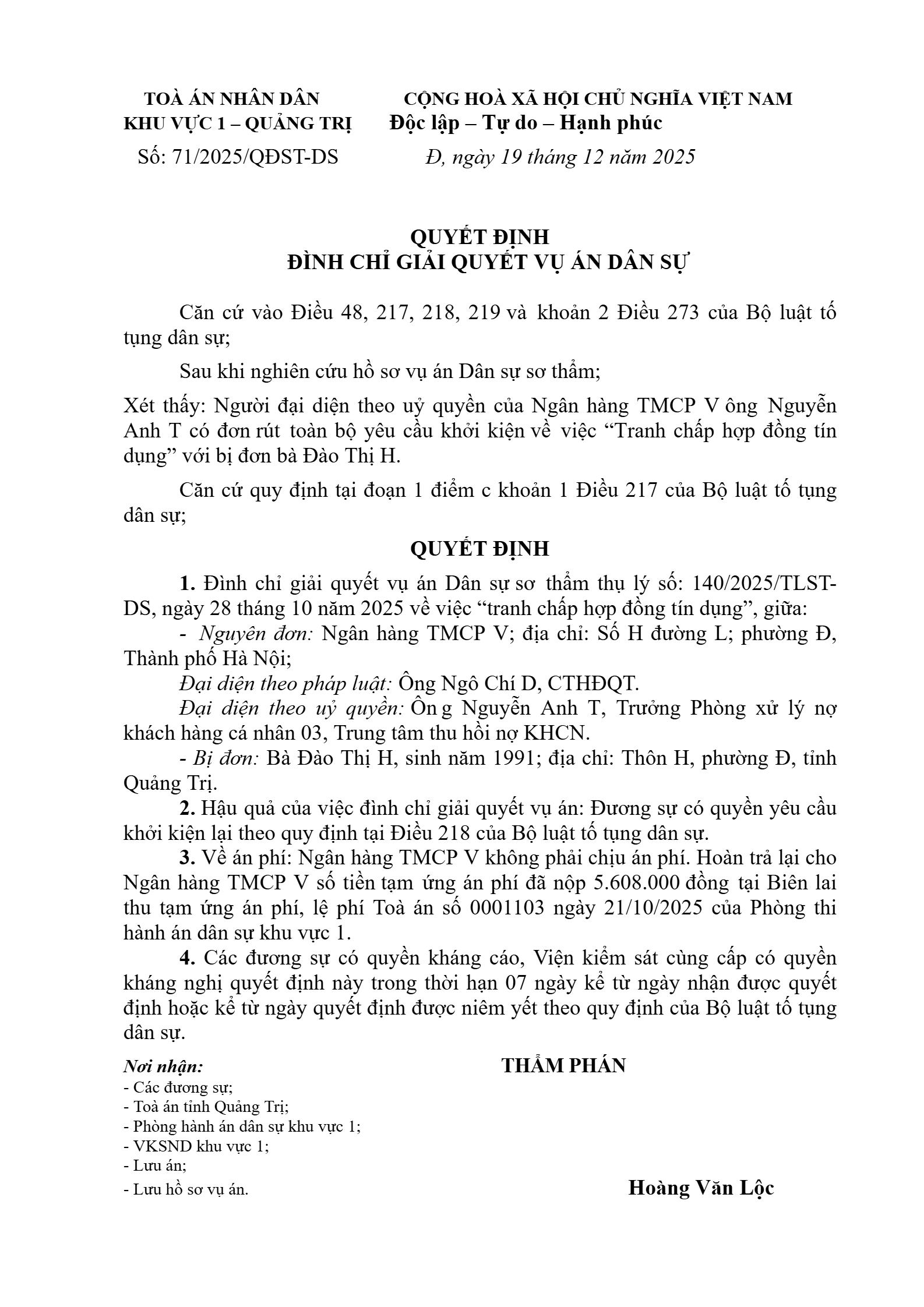 Quyết định số Só/2025/QĐST-DS ngày 19/12/2025 của Tòa án nhân dân khu vực 1 - Quảng Trị, tỉnh Quảng Trị về tranh chấp hợp đồng tín dụng