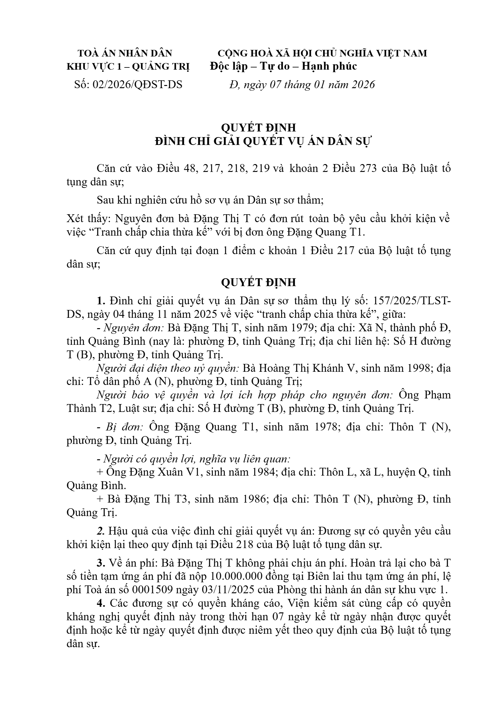 Quyết định số số/2026/QĐST-DS ngày 07/01/2026 của Tòa án nhân dân khu vực 1 - Quảng Trị, tỉnh Quảng Trị về tranh chấp về thừa kế tài sản