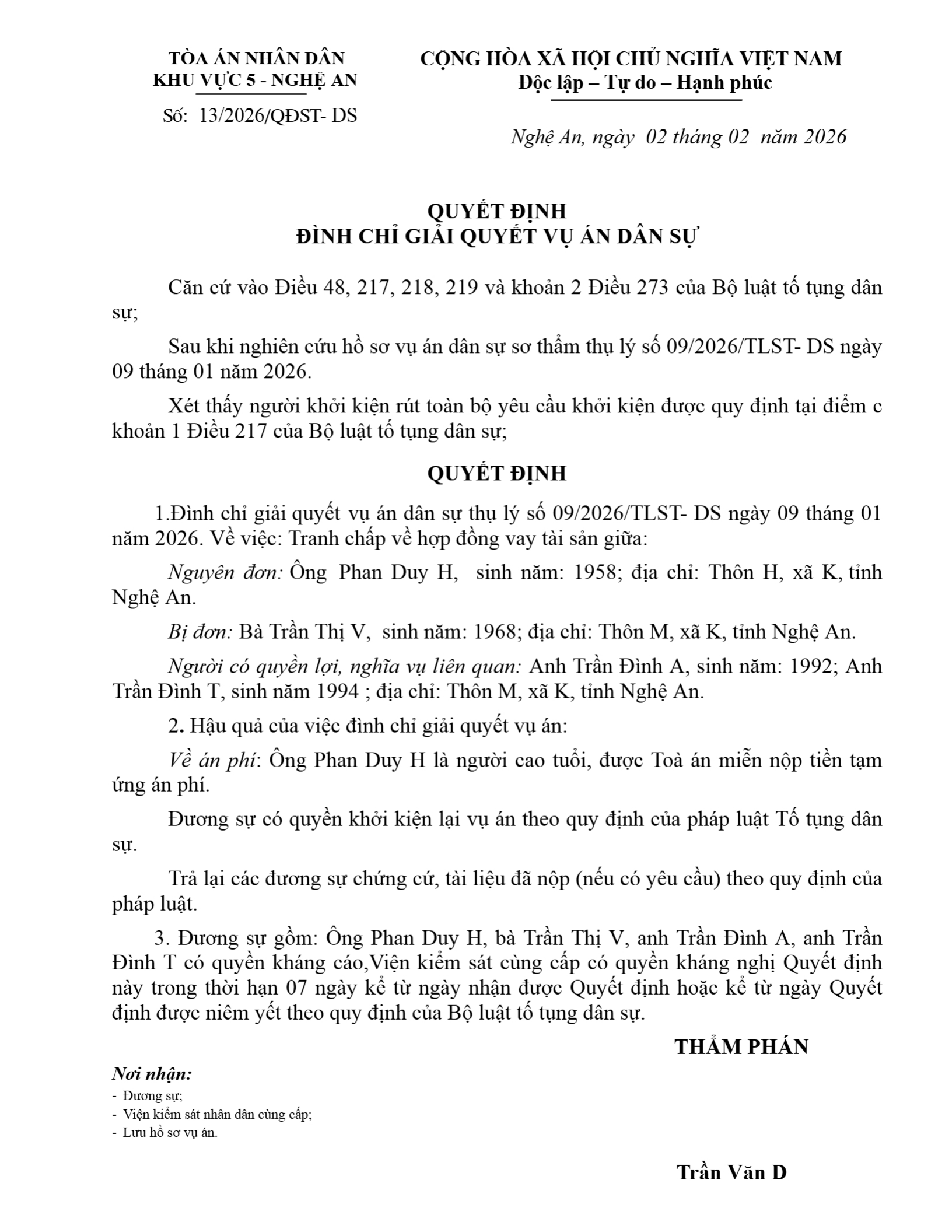 Quyết định số Số/2026/QĐST-DS ngày 02/02/2026 của Tòa án nhân dân khu vực 5 - Nghệ An, tỉnh Nghệ An về tranh chấp hợp đồng vay tài sản