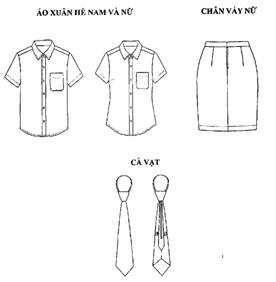 - Cà vạt (caravat): màu xanh navy, có độ dài rộng vừa phải, kiểu thắt sẵn, có khóa kéo, có chốt hãm tự động.