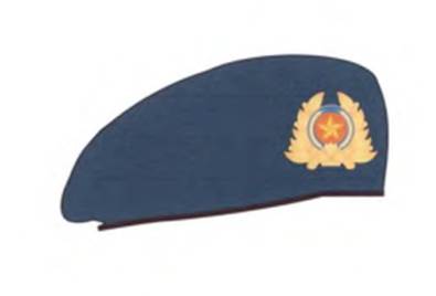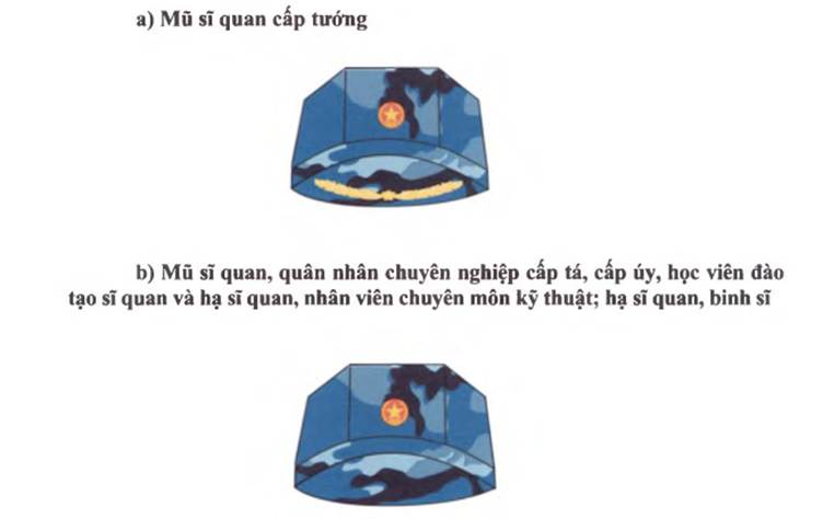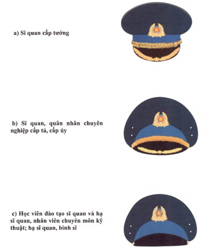 a) Mũ kê pi của sĩ quan cấp tướng; sĩ quan, quân nhân chuyên nghiệp cấp tá, cấp úy: Đỉnh mũ màu xanh tím than, thành mũ màu xanh dương, dây coóc đồng và riềm lưỡi trai màu vàng;