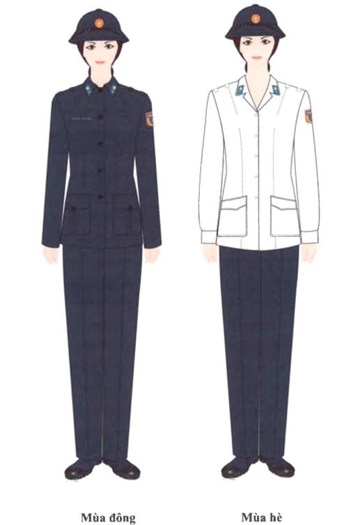 b) Áo nữ: Kiểu áo sơ mi dài tay, cổ bẻ. Mỗi bên đầu cổ áo thùa 2 khuyết đeo phù hiệu. Thân trước có chiết vai, chiết eo; hai túi dưới ốp nổi. Nẹp áo cài năm cúc. Vai áo có dây vai đeo cấp hiệu. Thân sau có sống sau may liền. Tay áo có thép tay, măng séc cài cúc; bên trái gắn lô gô Cảnh sát biển. Cúc áo đường kính 15 mm;