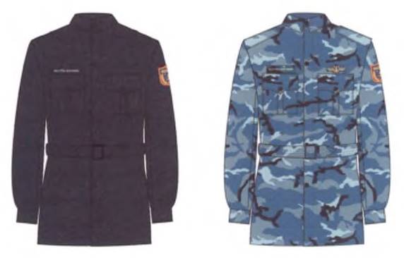 Áo: Kiểu áo khoác ngoài có lót, ve chữ V. Mỗi bên đầu cổ áo thùa hai khuyết đeo phù hiệu. Thân trước có chiết vai. Hai túi ốp nổi ở dưới thân trước, nắp túi cài cúc đường kính 22 mm. Nẹp áo cài bốn cúc đường kính 22 mm. Thân sau có sống sau xẻ dưới. Vai áo có dây vai đeo cấp hiệu. Tay áo dài, bên trái gắn lô gô Cảnh sát biển;