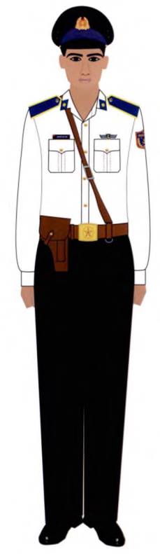 Áo: Kiểu áo sơ mi ngắn tay, cổ đứng. Mỗi bên đầu cổ áo thùa hai khuyết đeo phù hiệu. Ngực có hai túi ốp nổi, nắp túi cài cúc. Nẹp áo cài năm cúc và một cúc chân cổ. Vai áo có dây vai đeo cấp hiệu. Tay áo bên trái gắn lô gô Cảnh sát biển. Thân sau có cầu vai xếp hai ly. Cúc áo đường kính 15 mm;