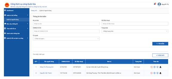 Admin sau khi đăng nhập thành công hệ thống, chọn menu [Quản trị hệ thống] -> [Quản lý người dùng], hệ thống hiển thị màn hình như sau: