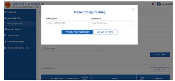Admin bấm nút [Thêm mới] trên màn hình, hệ thống hiển thị giao diện như sau (Lưu ý: cán bộ UBND các cấp phải có tài khoản công dân trên cổng DVCQG):
