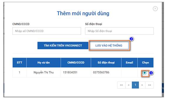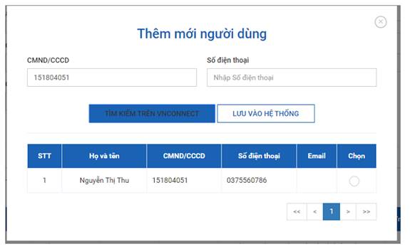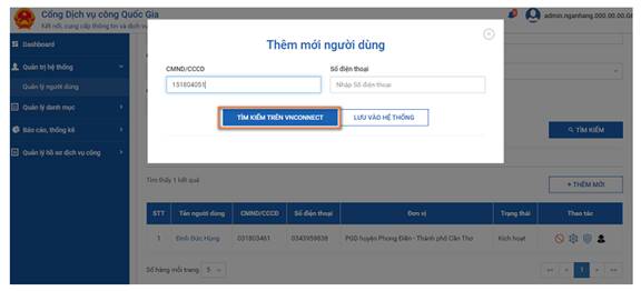 Admin nhập số CMND/CCCD hoặc số điện thoại của cán bộ UBND các cấp, sau đó bấm nút [Tìm kiếm trên vnconnect] để thực hiện tìm kiếm: