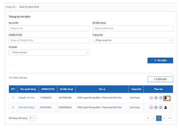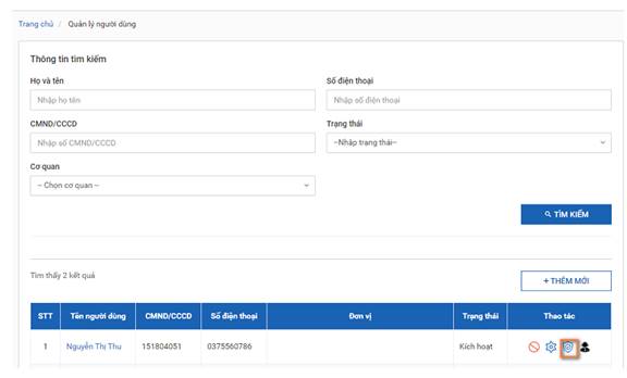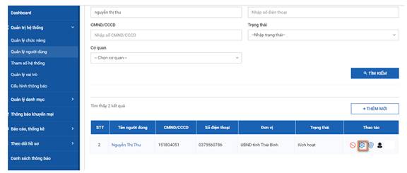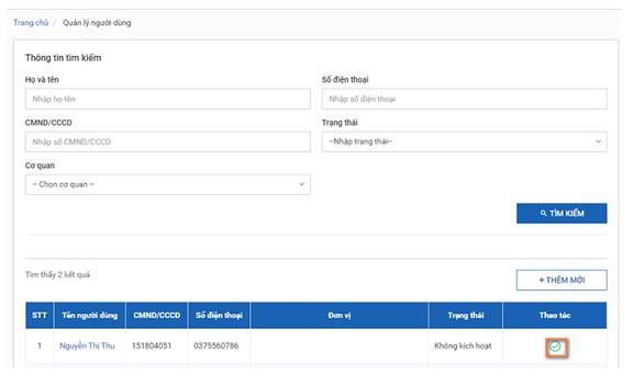 Sau khi lưu vào hệ thống, người dùng sẽ nằm trong danh sách người dùng, Admin thực hiện kích hoạt tài khoản cho người dùng đó như sau: