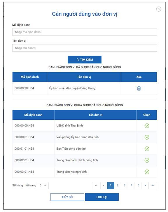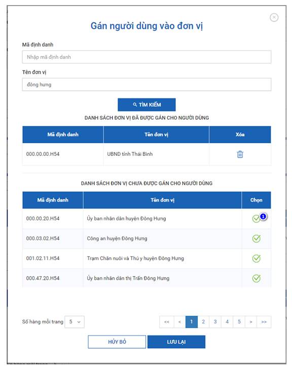 Admin nhập mã định danh hoặc tên đơn vị để thực hiện tìm kiếm, sau đó bấm nút [Tìm kiếm], hệ thống sẽ hiển thị kết quả tìm kiếm. Trên danh sách các đơn vị theo kết quả tìm kiếm, Admin chọn đơn vị cần gán cho người dùng và bấm nút [Lưu lại] để hoàn thành việc gán đơn vị cho người dùng, như sau: