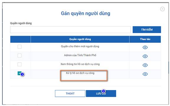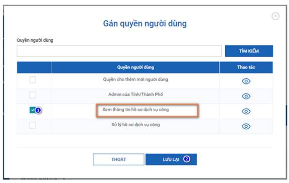 Admin click icon [Gán quyền] của người dùng cần gán quyền như sau: