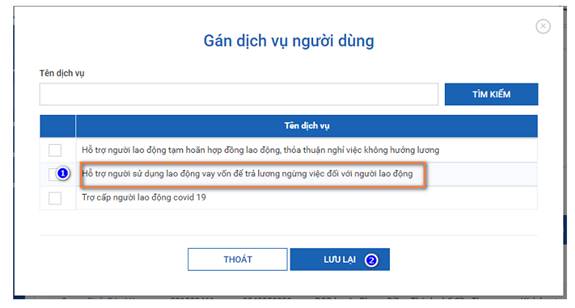 Hệ thống hiển thị giao diện cấu hình dịch vụ cho người dùng, Admin tick chọn dịch vụ “Hỗ trợ người sử dụng lao động vay vốn để trả lương ngừng việc đối với người lao động” hoặc “Hộ trợ người lao động tạm hoãn hợp đồng lao động, thỏa thuận nghỉ việc không hưởng lương” hoặc cả 2 dịch vụ tùy thuộc thẩm quyền xử lý của từng cán bộ và bấm nút [Lưu lại] để hoàn thành việc gán dịch vụ, như sau: