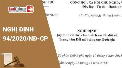 Nghị định 94/2020/NĐ-CP chính sách ưu đãi với Trung tâm Đổi mới sáng tạo Quốc gia
