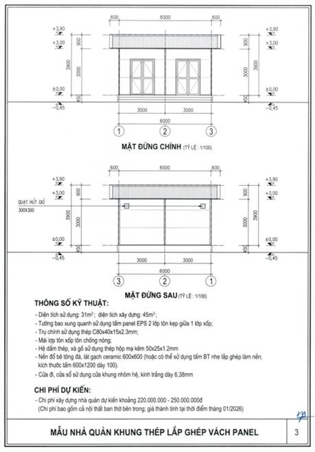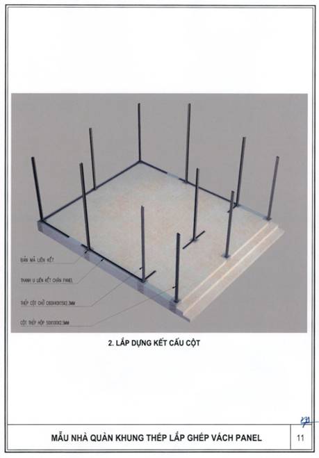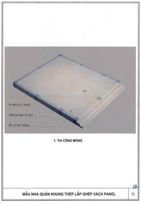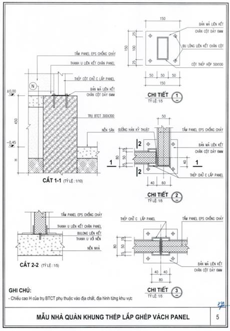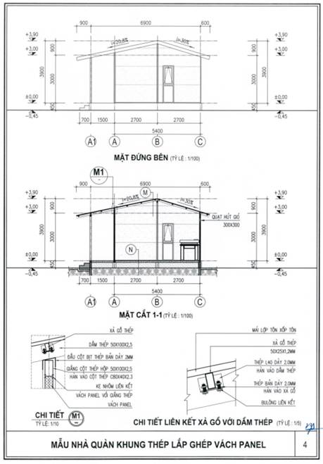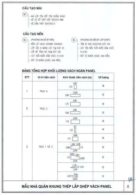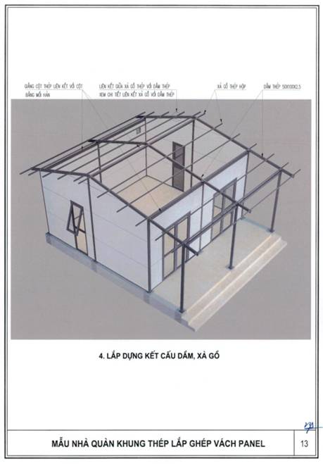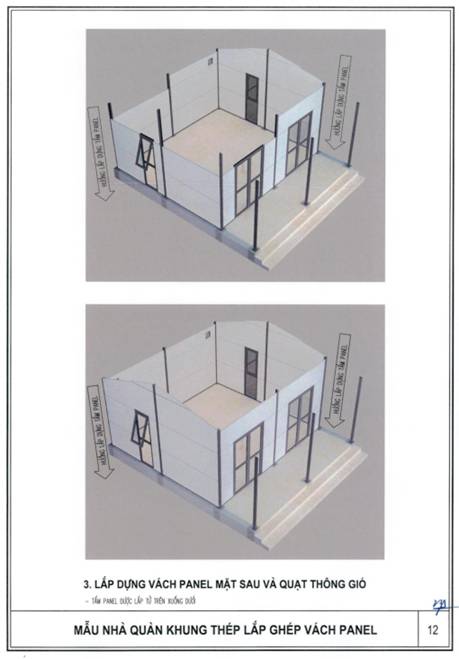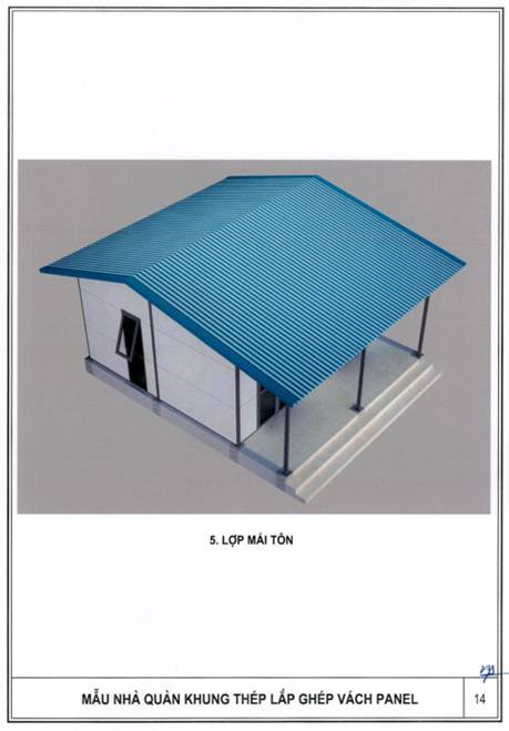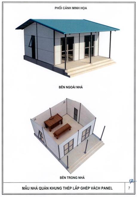 b) Khung nhà sử dụng kết cấu thép; tường bao xung quanh sử dụng tấm panel lắp ghép hoặc vật liệu tương đương; nền nhà sử dụng bê tông hoặc vật liệu phù hợp, bề mặt lát gạch ceramic, granite nhân tạo hoặc vật liệu có tính năng tương đương; mái sử dụng vật liệu chống nóng, chống thấm, bảo đảm điều kiện sử dụng.