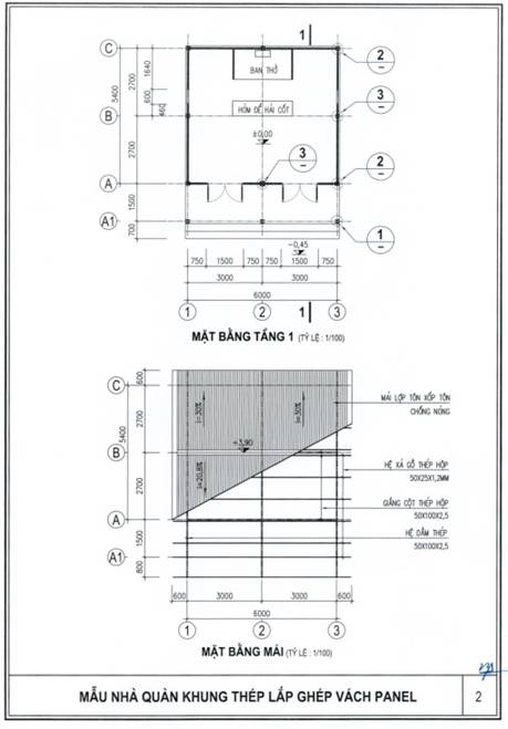 Nhà quàn thờ cúng liệt sĩ được thiết kế dạng lắp ghép, có thể tháo rời để dễ dàng vận chuyển và lắp dựng lại. Vật liệu sử dụng phải đảm bảo độ bền, chịu được thời tiết và dễ thi công. Nhà quàn cần có hệ thống chiếu sáng và thông gió phù hợp, ưu tiên ánh sáng tự nhiên. Bên trong, nhà quàn bố trí bàn thờ liệt sĩ và khu vực bảo quản hài cốt, đảm bảo trang nghiêm và phù hợp với phong tục địa phương.