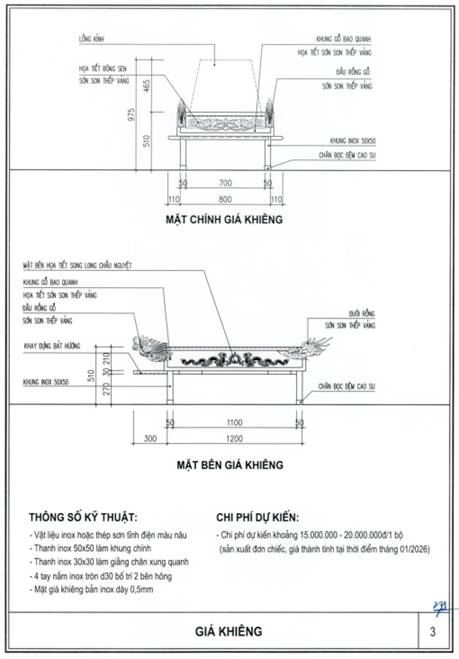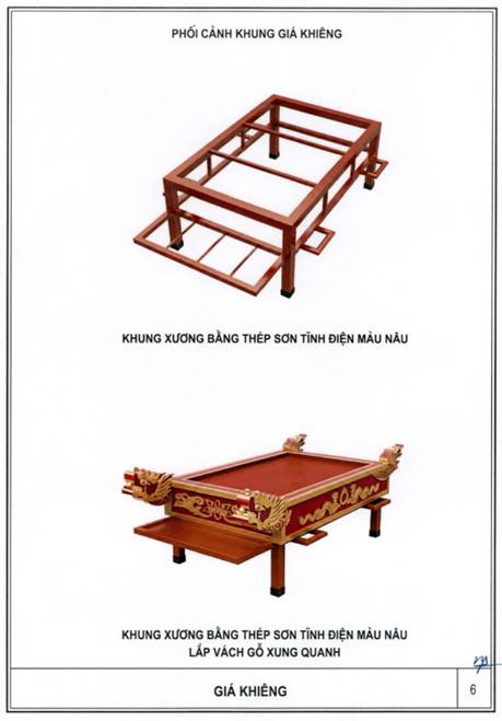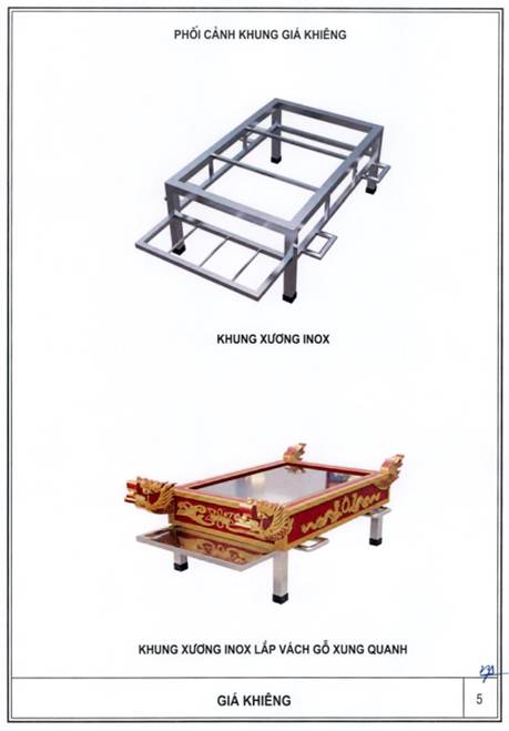 Giá khiêng được chế tạo từ kim loại hoặc vật liệu có độ bền tương đương, bảo đảm chắc chắn, dễ dàng trong di chuyển. Tay khiêng bố trí phù hợp hai bên; mặt giá phẳng, ổn định. Phía trước bố trí khay đặt đồ thờ (bát hương, lọ hoa, đĩa hoa quả) bảo đảm an toàn, không trượt rơi trong quá trình di chuyển. Khung giá khiêng sử dụng inox hoặc thép sơn tĩnh điện với màu sắc trang nghiêm;