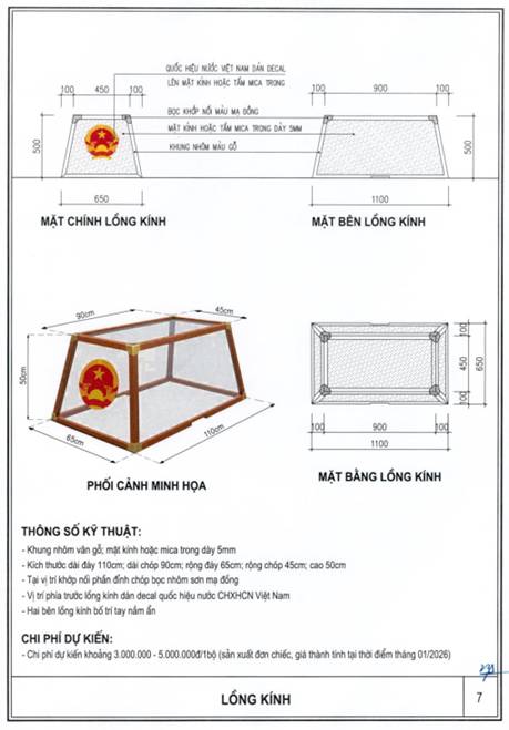 Lồng kính: Có khung kim loại, bao bọc bằng kính trong suốt, mặt trước có biểu trưng Quốc huy. Lồng kính phải đảm bảo an toàn, không trầy xước và dễ vệ sinh.