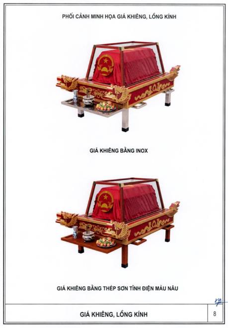 Lồng kính có khung bằng kim loại hoặc vật liệu phù hợp, bao bọc xung quanh bằng kính hoặc vật liệu trong suốt tương đương, để hở mặt đáy; mặt trước bố trí biểu trưng Quốc huy nước Cộng hòa xã hội chủ nghĩa Việt Nam;