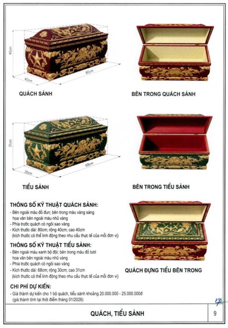 b) Hình thức, màu sắc: Quách và tiểu sành có hình khối phù hợp, màu sắc tôn nghiêm; hoa văn trang trí truyền thống, phía trước có thể bố trí biểu trưng ngôi sao theo quy định;