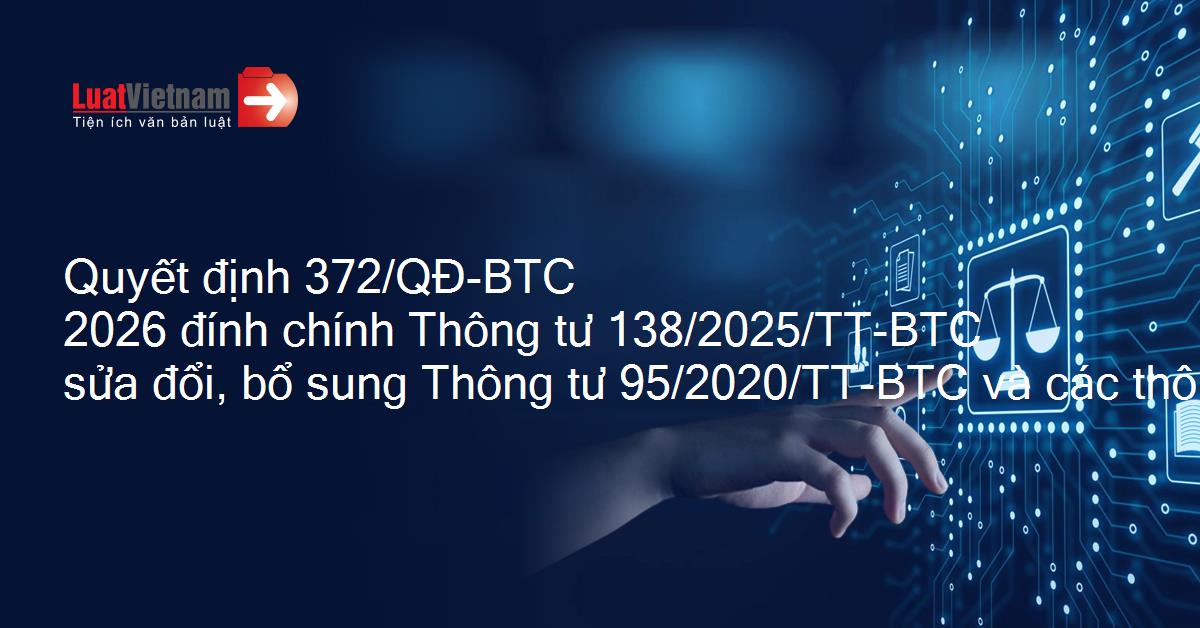Quyết định 372/QĐ-BTC 2026 đính chính Thông tư 138/2025/TT-BTC sửa đổi, bổ sung Thông tư 95/2020/TT-BTC và các thông tư liên quan