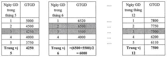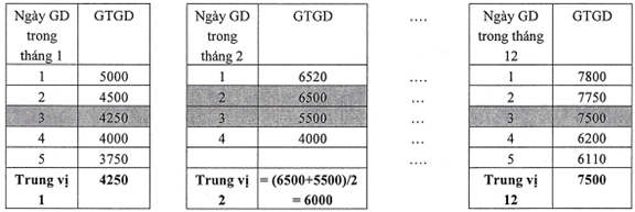 a. Trung vị giá trị giao dịch hàng ngày trong tháng được xác định bằng cách sắp xếp theo thứ tự giảm dần giá trị giao dịch hàng ngày trong tháng, chọn giá trị ở giữa làm trung vị (trong trường hợp có 2 ngày ở giữa thì sẽ lấy giá trị bình quân của 2 ngày này).