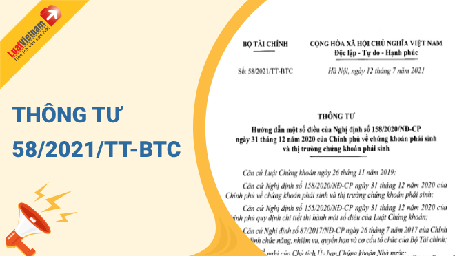 Ngày 12/7/2021, Bộ Tài chính ban hành Thông tư 58/2021/TT-BTC về việc hướng dẫn một số điều của Nghị định 158/2020/NĐ-CP ngày 31/12/2020 của Chính phủ về chứng khoán phái sinh và thị trường chứng khoán phái sinh.