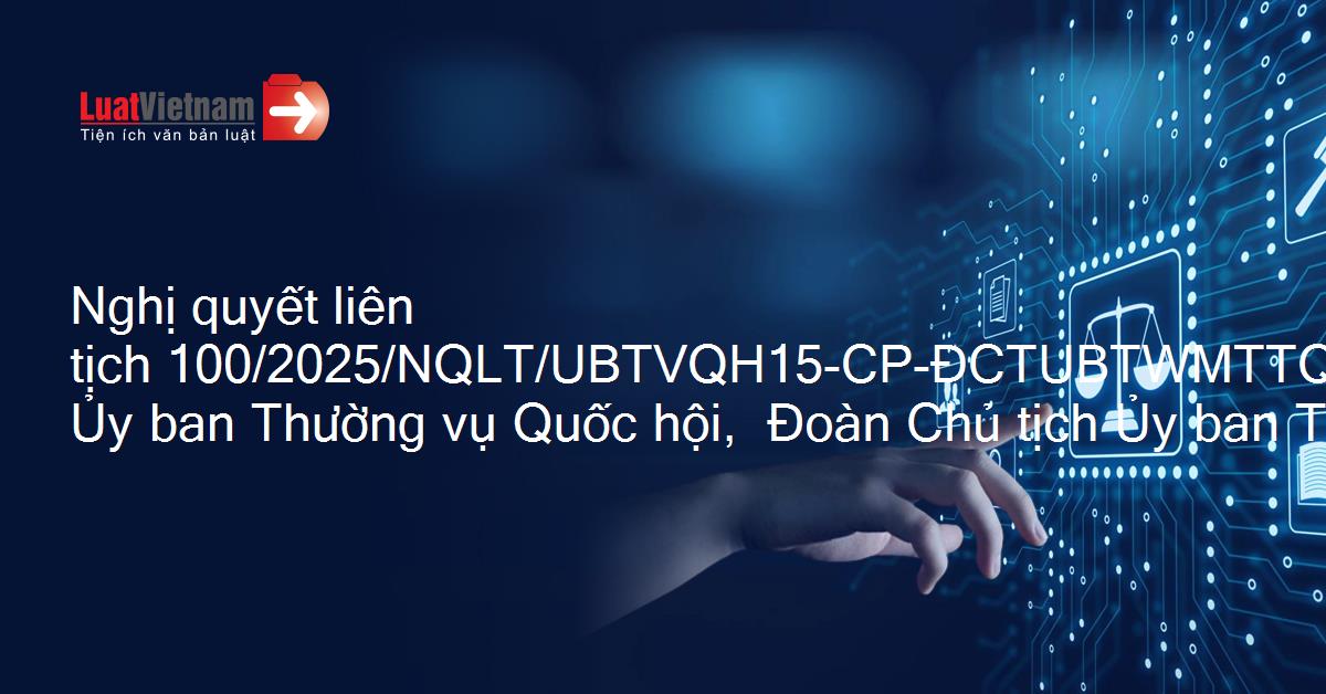 | Số hiệu: | 100/2025/NQLT/UBTVQH15-CP-ĐCTUBTWMTTQVN | Ngày đăng công báo: | Đang cập nhật |