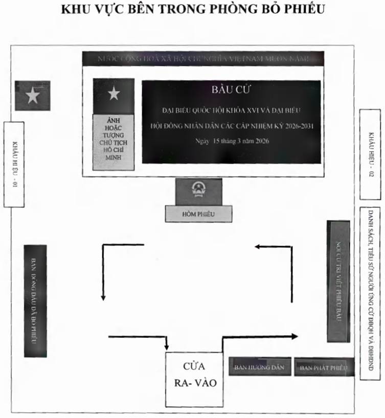 1. Nội quy phòng bỏ phiếu thực hiện theo quy định tại Điều 4 Nghị quyết số 40/NQ-HĐBCQG ngày 29 tháng 9 năm 2025 của Hội đồng bầu cử quốc gia quy định mẫu hồ sơ ứng cử, mẫu phiếu bầu cử, nội quy phòng bỏ phiếu và các loại mẫu văn bản sử dụng trong công tác bầu cử đại biểu Quốc hội khóa XVI và đại biểu Hội đồng nhân dân các cấp nhiệm kỳ 2026 - 2031.