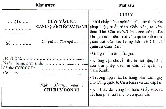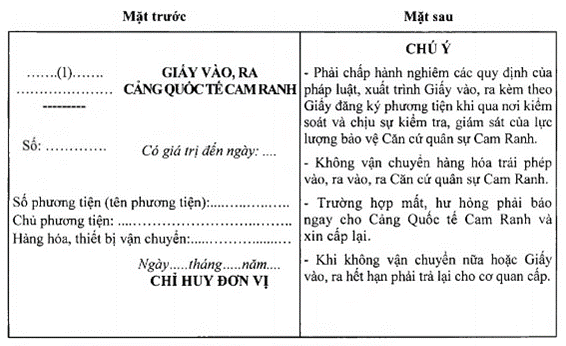 [22] Mẫu này được bãi bỏ theo quy định tại khoản 3 Điều 2 của Quyết định số 38/2025/QĐ-TTg sửa đổi, bổ sung một số điều của Quy chế quản lý hoạt động Cảng quốc tế Cam Ranh - Bộ Quốc phòng ban hành kèm theo Quyết định số 25/2016/QĐ-TTg ngày 27 tháng 6 năm 2016, được sửa đổi, bổ sung tại Quyết định số 29/2019/QĐ-TTg ngày 03 tháng 10 năm 2019 của Thủ tướng Chính phủ, có hiệu lực thi hành từ ngày 01 tháng 12 năm 2025.