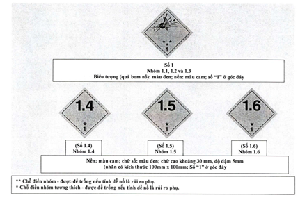 - Loại 1. Chất nổ và vật phẩm dễ nổ gồm 6 nhóm: Nhóm 1.1: Chất và vật phẩm có nguy cơ nổ rộng; nhóm 1.2: Chất và vật phẩm có nguy cơ bắn tóe nhưng không nổ rộng; nhóm 1.3 : Chất và vật phẩm có nguy cơ cháy và nguy cơ nổ nhỏ hoặc bắn tóe nhỏ hoặc cả hai, nhưng không nổ rộng; nhóm 1.4: Chất và vật phẩm có nguy cơ không đáng kể; nhóm 1.5: Chất không nhạy nhưng có nguy cơ nổ rộng; nhóm 1.6: Vật phẩm đặc biệt không nhạy, không có nguy cơ nổ rộng.