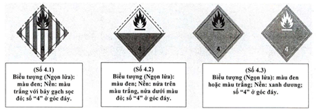 - Loại 4 gồm 3 nhóm: Nhóm 4.1: Chất rắn dễ cháy, chất tự phản ứng và chất nổ rắn được ngâm trong chất lỏng hoặc bị khử nhạy; nhóm 4.2: Chất có khả năng tự bốc cháy; nhóm 4.3: Chất khi tiếp xúc với nước tạo ra khí dễ cháy.