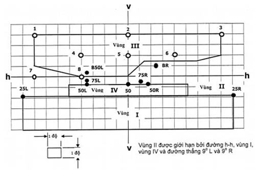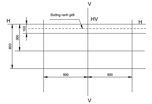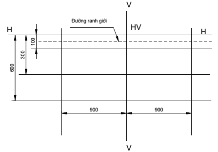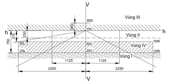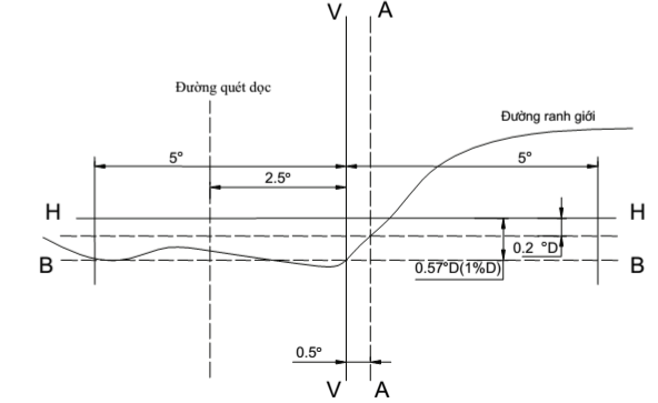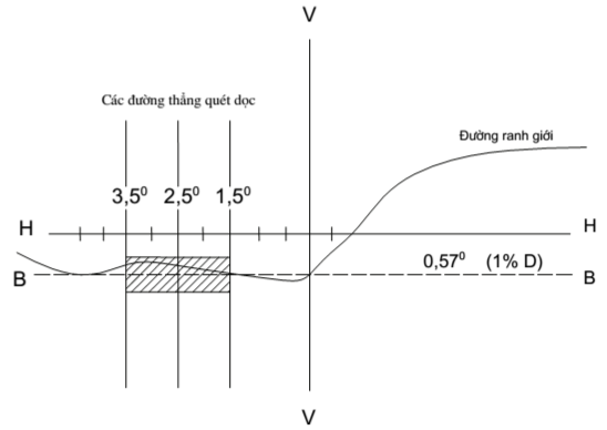 Việc quét được thực hiện từ dưới lên qua đường ranh giới theo các đường dọc (Hình 2) lần lượt cách đường V-V các góc ± 3º hoặc ± 1310 mm. Khi đo như vậy, chất lượng của đường ranh giới phải phù hợp các yêu cầu sau đây: