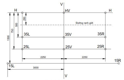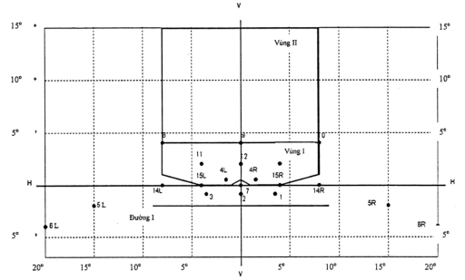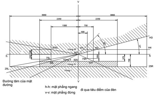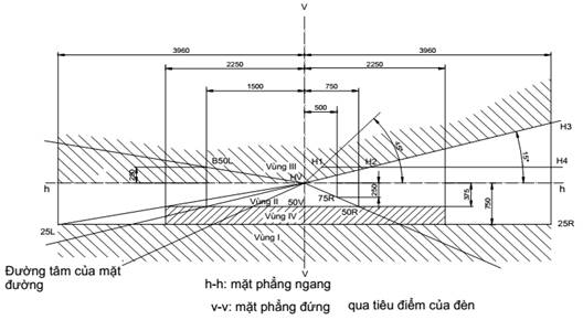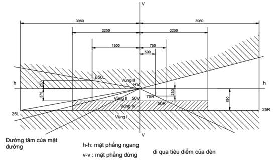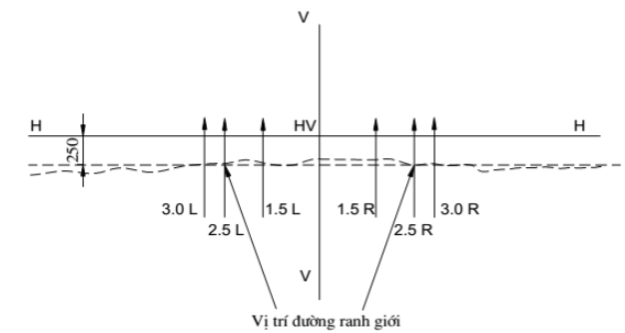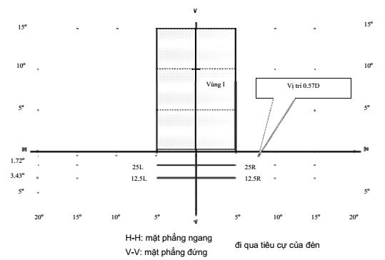 Phần của đường ranh giới nằm ngang dùng để điều chỉnh phương thẳng đứng phải nằm giữa 2 đường thẳng lần lượt cách đường V-V một góc 1,5º hoặc 655 mm và 3,5º hoặc 1529 mm (xem Hình 1).