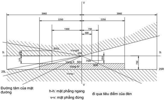 Phân bố cường độ ánh sáng của chùm ánh sáng đối xứng của đèn chiếu sáng phía trước xen kẽ với đường ranh giới cho phép chùm ánh sáng đối xứng được điều chỉnh 1 cách chính xác các phép đo độ sáng và định hướng cho phương tiện. Các đặc tính của đường ranh giới phải đáp ứng các yêu cầu quy định trong tại điểm 2, 3, 4 Phụ lục này.
