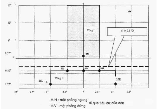 Quét dọc từ vị trí lệch dưới 2º hoặc 873 mm đến lệch trên 2º hoặc 873 mm theo 3 đường thẳng lần lượt cách đường V-V về bên phải 1º hoặc 436 mm, 2º hoặc 873 mm, 3º hoặc 1310 mm sau khi đèn đã được điều chỉnh dọc. Các giá trị G lớn nhất tương ứng được xác định bằng công thức: