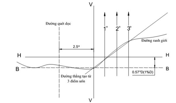 Quét dọc từ dưới lên theo đường thẳng cách đường V-V một góc 2,5º hoặc 1092 mm (xem Hình 2). Điểm uốn tại đó được xác định và điều chỉnh vị trí về đường B-B nằm dưới cách đường H-H một góc 0,57º hoặc 250 mm.